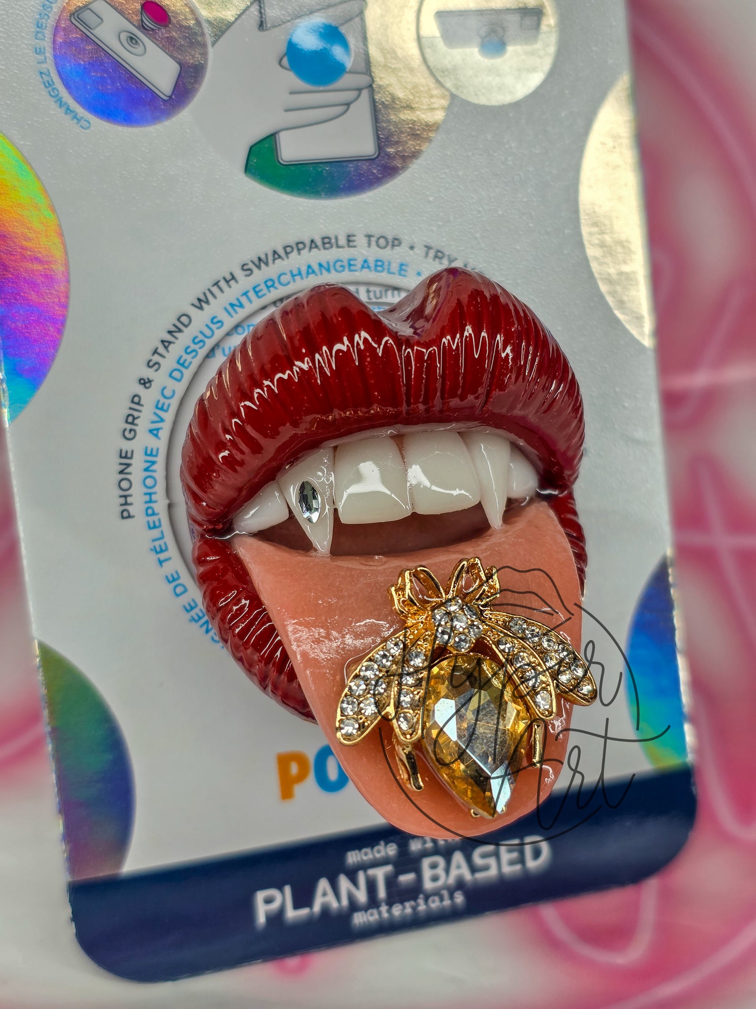 Make a bold statement with the Auren Popsocket, featuring a striking rust-colored lip design and a unique jeweled bee adorned with a radiant citrine belly. The gleaming gem on the tooth adds an edgy touch, perfect for those who dare to stand out and express their fearless style. Elevate your phone grip with this daring accessory that combines vibrant color and intricate detailing.