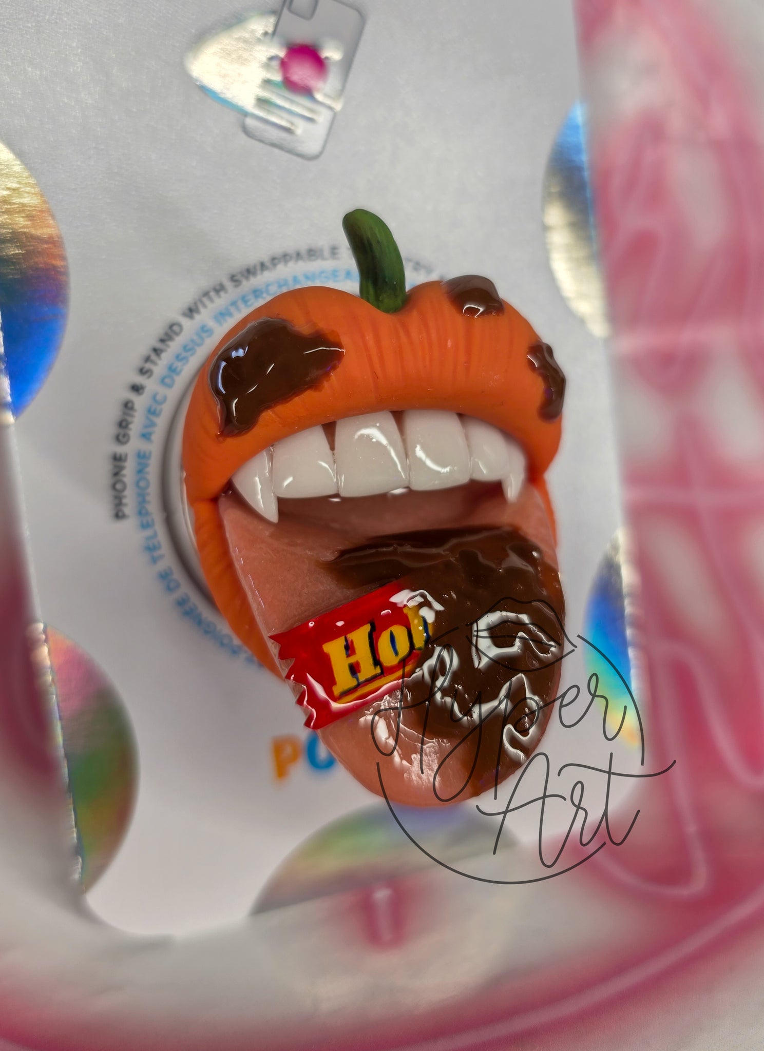 Embrace a bold Halloween vibe with this Bite Size Popsocket featuring pumpkin-colored lips inspired by Sam from Trick 'r Treat. Detailed with a Hollie Ho wrapper and melted chocolate dripping on the tongue and lips, this striking design adds a daring, festive edge to your phone accessory. Perfect for fans who want to stand out with a spooky, sweet twist.