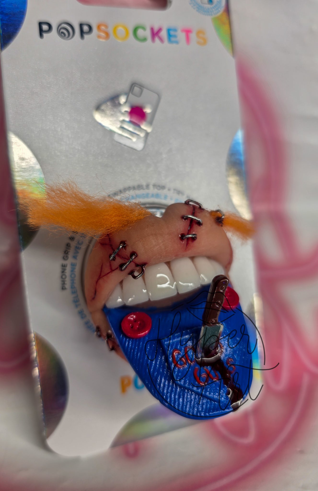 The Good Guy Gone Wild Popsocket boldly captures the unsettling charm of a horror icon. Featuring a nude lip design marked by cuts and staples, with tufts of hair intricately attached, it channels a fierce, edgy vibe. The tongue, styled to mimic classic jean overalls, is pierced by a knife for a daring, nightmarish detail. This unique accessory brings a thrilling twist to your device, perfect for those who embrace bold, fearless style.