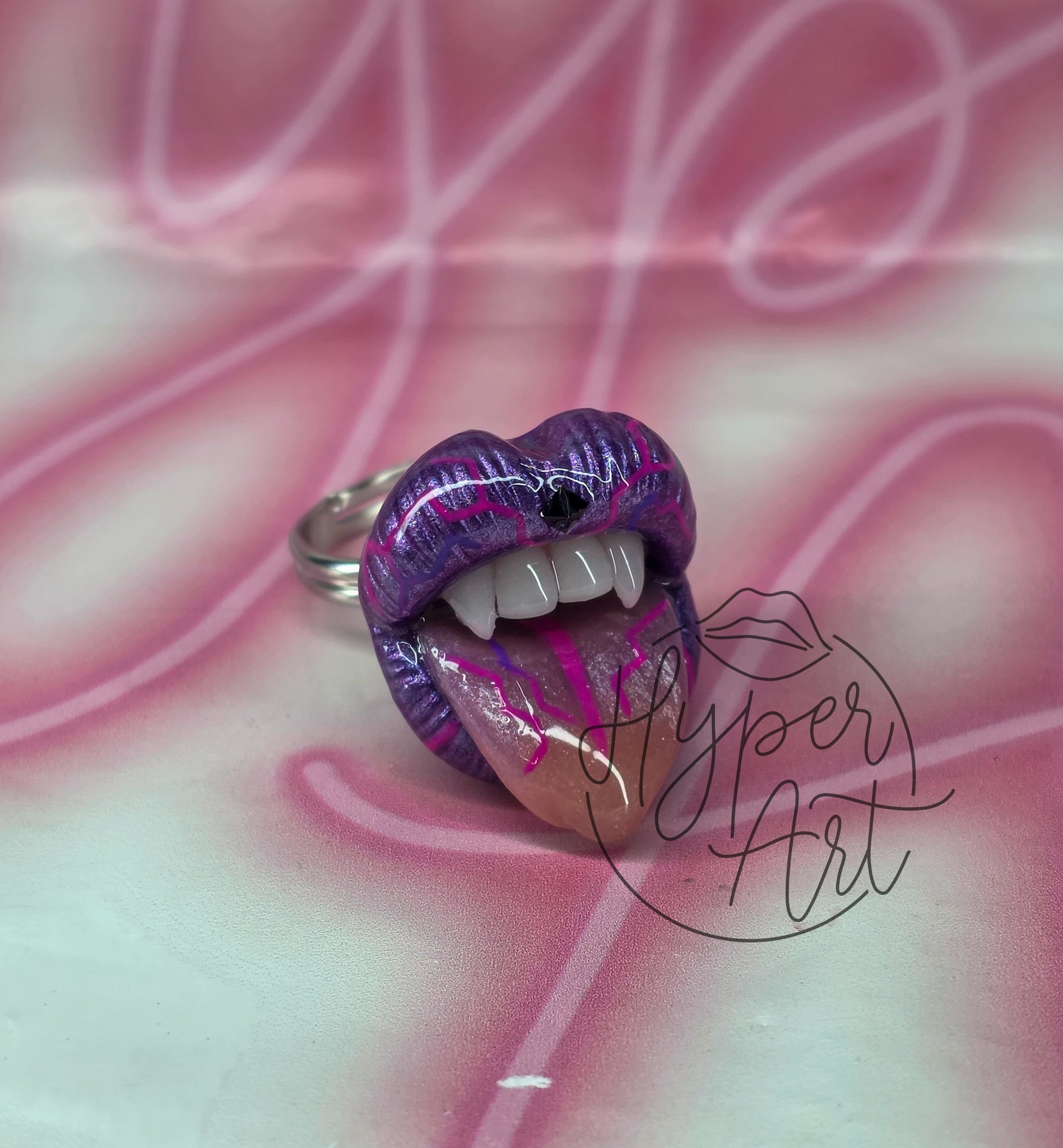Unleash your bold and daring side with IonLine Ring! This metallic purple lip color is elevated with vibrant galactic designs in neon pink, while a black gem adds a touch of edginess to the top lip. With futuristic pink designs on the tongue, this ring will surely make a statement. Ready to take on the cosmic adventure?