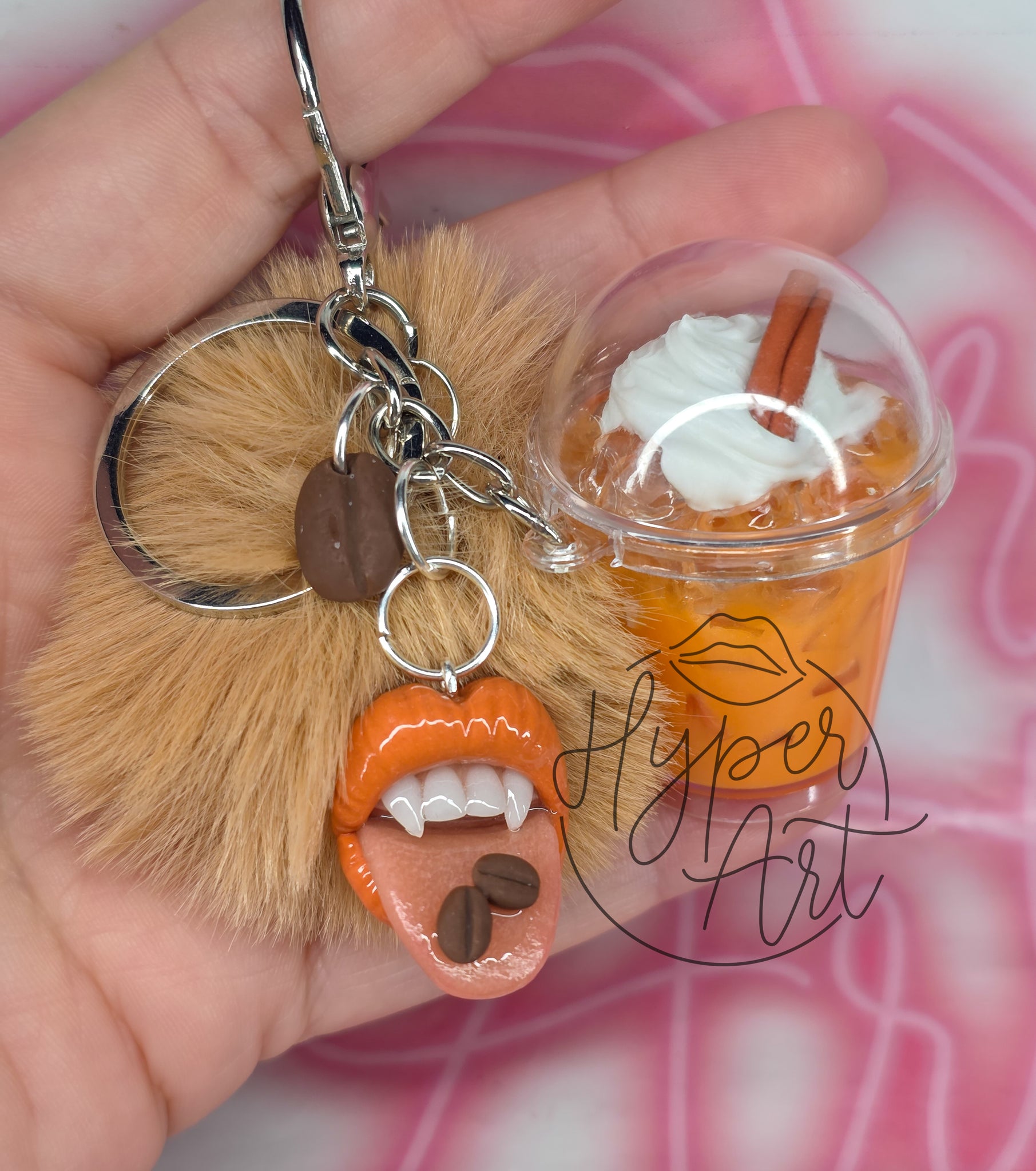 Capture attention with the Miss PSL Micro Mouth Keychain—a bold blend of mini orange drink charm with a cinnamon stick accent, accented by a striking mouth sporting vibrant orange lips. A playful touch of coffee beans on the tongue adds intrigue, while a tiny coffee bean charm completes this edgy accessory. Perfect for those who dare to mix sweetness and spice in their style.