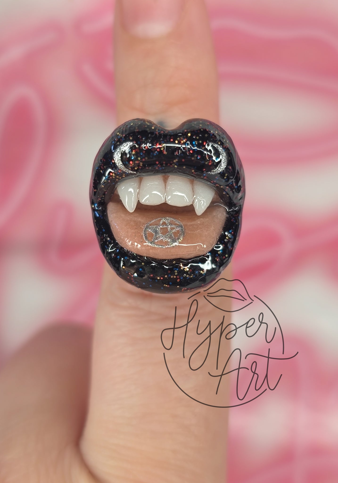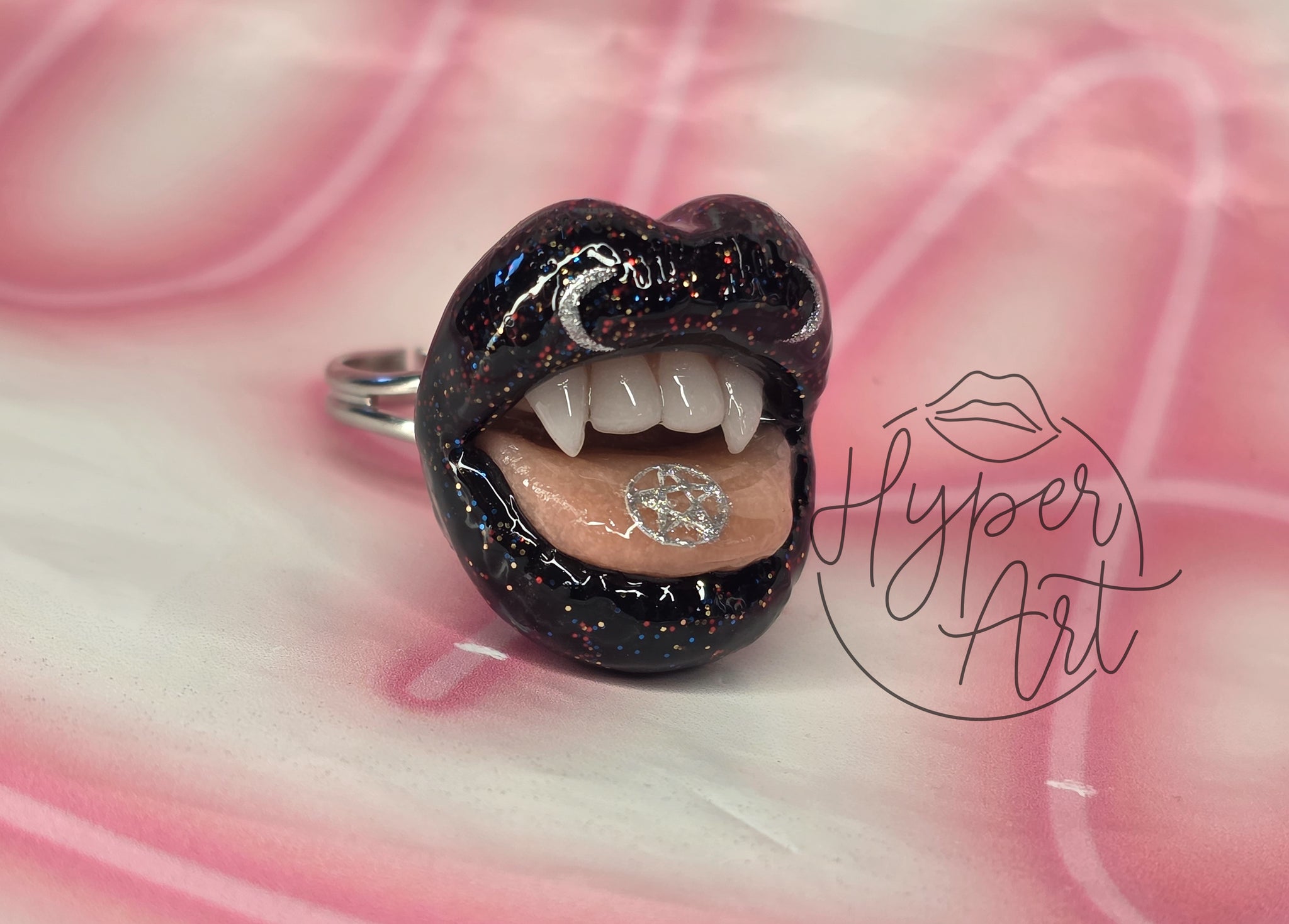 Make a bold statement with Nyx Ring, featuring striking red, silver, and blue glitter lips. Accentuated by moons on each side of the top lip and a barely visible pentagram on the tongue, this design channels edgy mystique perfect for those who dare to stand out.