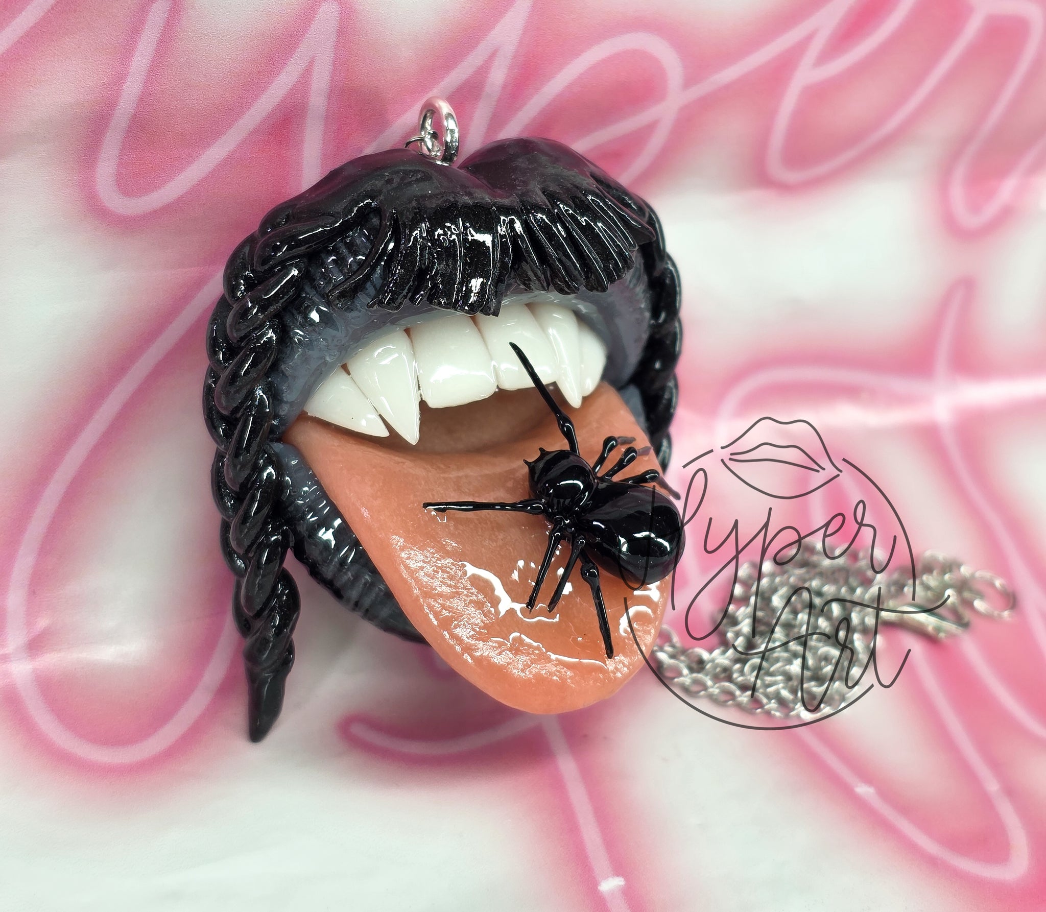 Embrace your dark side with the Pigtails & Poison Necklace. Featuring daring Wednesday-themed pigtails, a creepy spider crawling up a tongue, and striking double fangs, this necklace makes a bold statement. Worn on a sleek chain, it captures a fearless edge perfect for those who love to stand out with a touch of eerie charm.