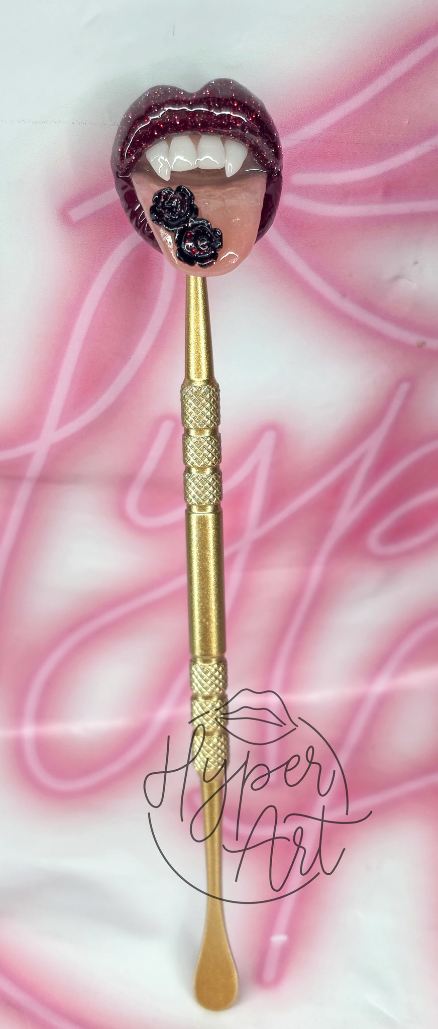 Heat, glamor, and attitude in one sculpted hit stick. Deep red lips stacked with red high shine glitter on the top lip pulls you in, while the black roses on the tongue give it a dark, dangerous edge HyperArt is known for. Hand-sculpted, sealed and built on a real heat-safe metal base, this piece is made to stir, scoop, and flex on your whole tray.