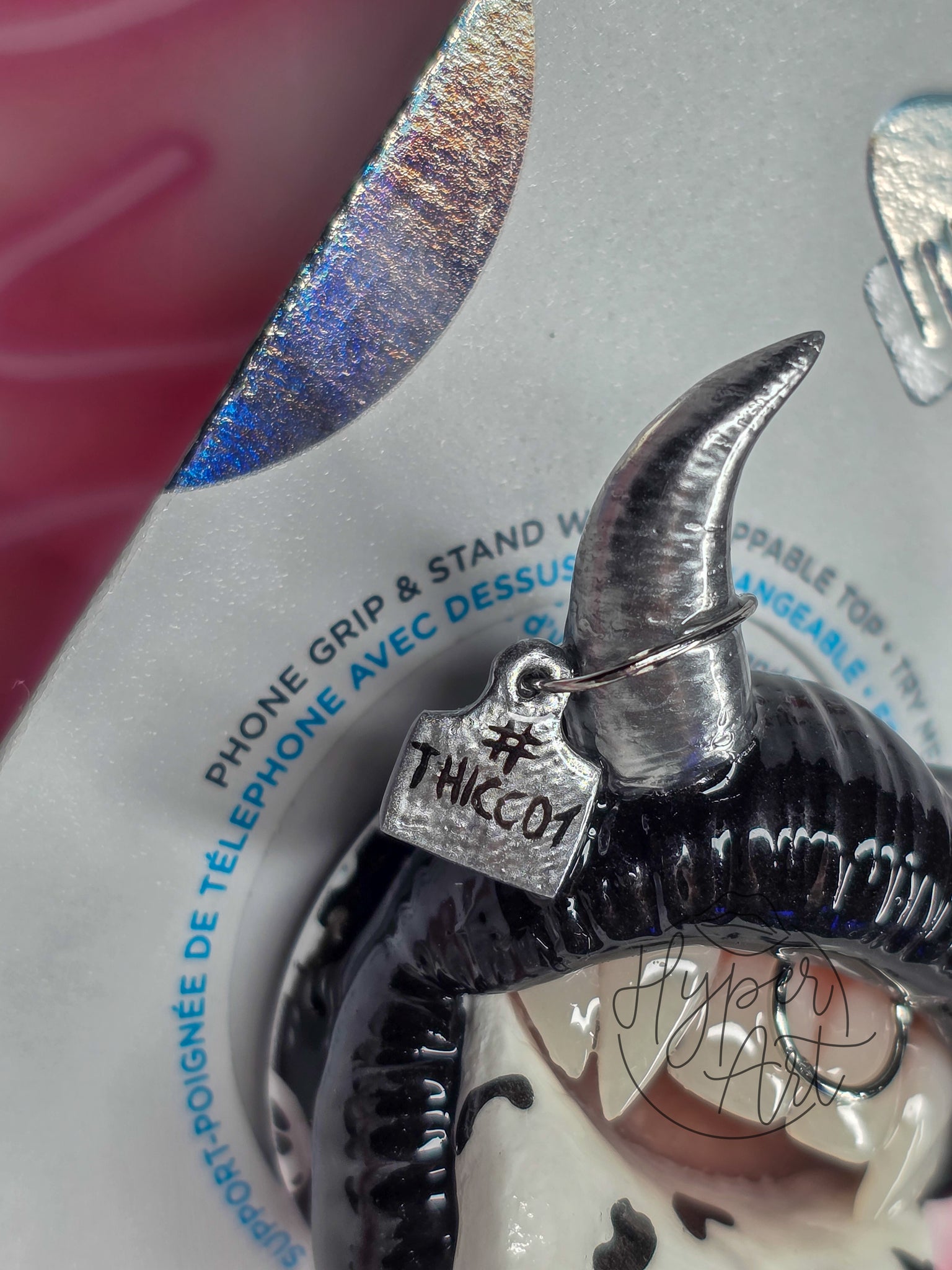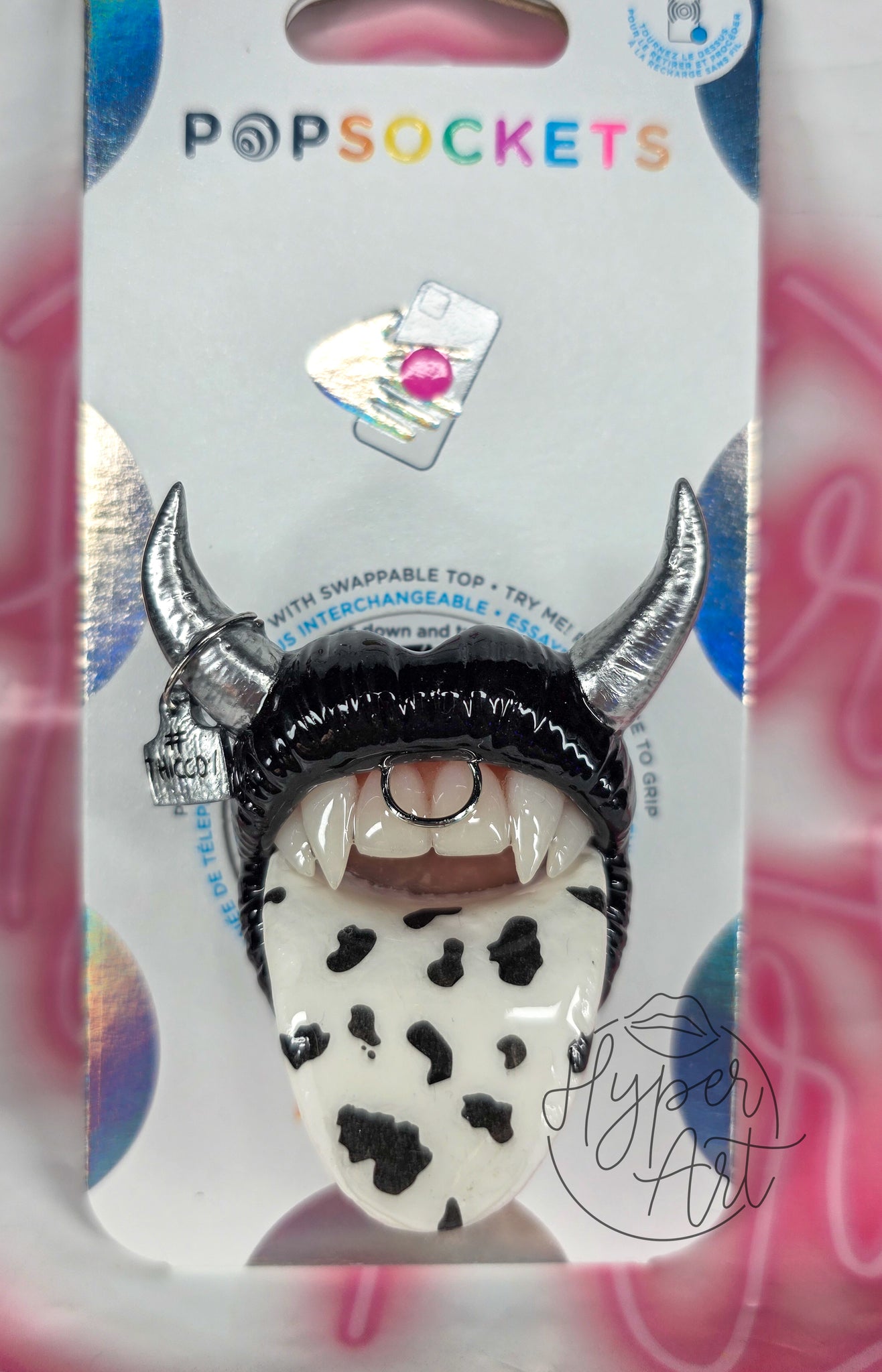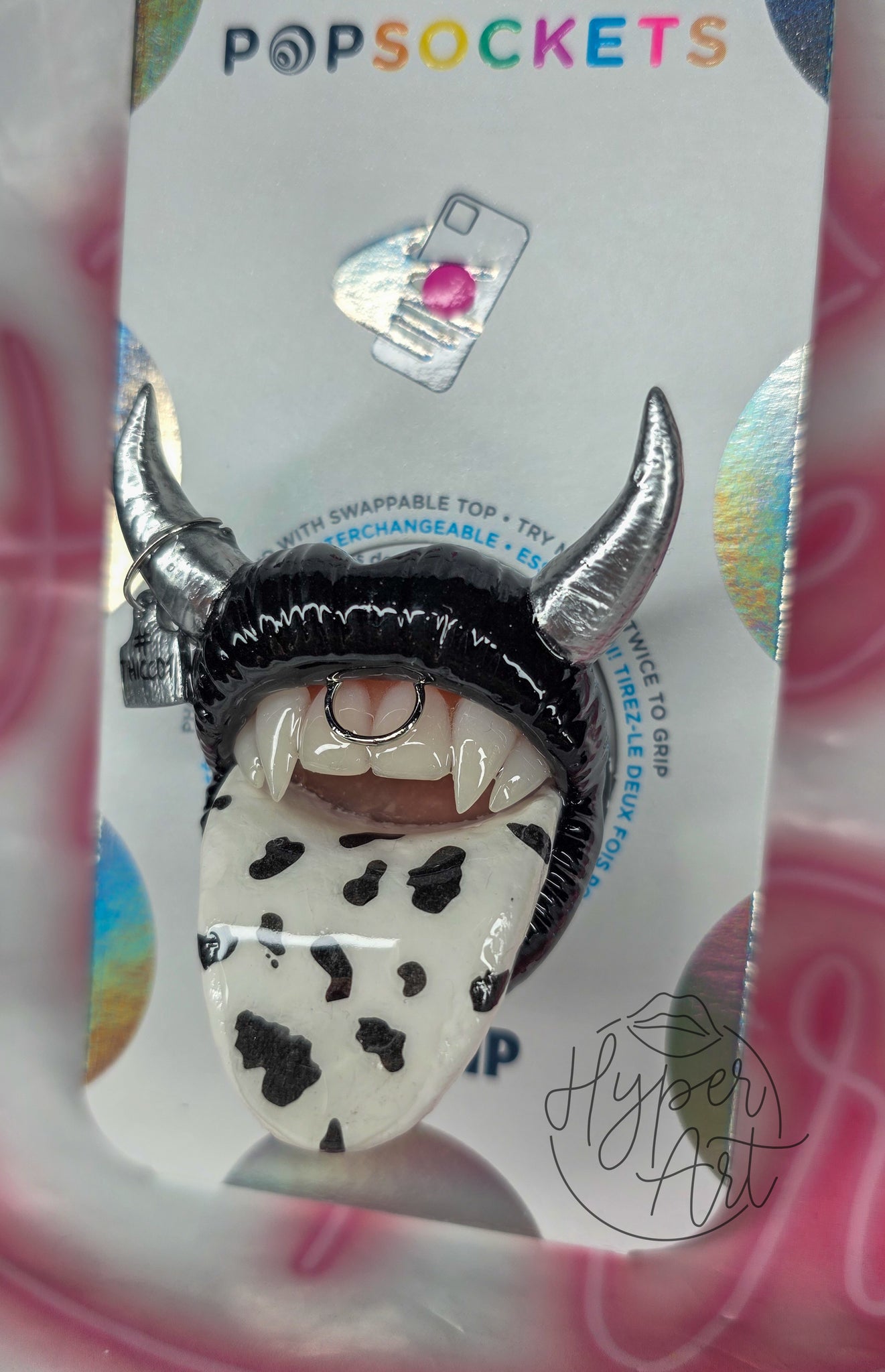 Add a bold twist to your device with the Rodeo Reject Popsocket! Featuring black lips, shiny silver horns, and a cheeky smiley piercing, this design stands out. The cow print tongue adds a quirky touch, while the ear tag labeled "thicc01" brings playful attitude. Perfect for those who love unique, fun accessories that make a statement.