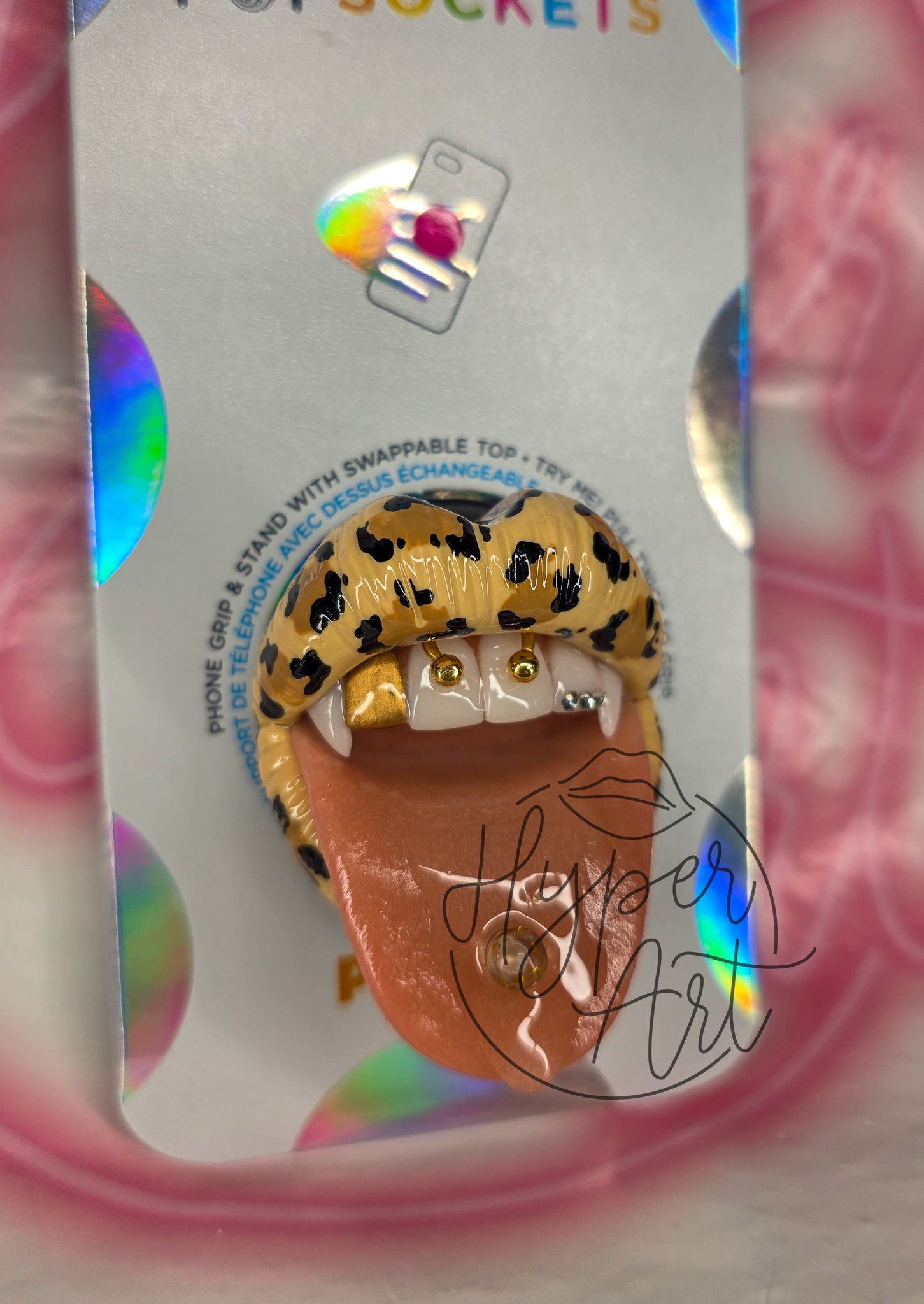 Unleash your wild side with the Safari Vice Popsocket. This bold and daring design features a leopard lip, gold smiley piercing, and a tongue ring, all accented with a gold tooth and gems. Take a risk and stand out from the crowd with this fierce accessory!