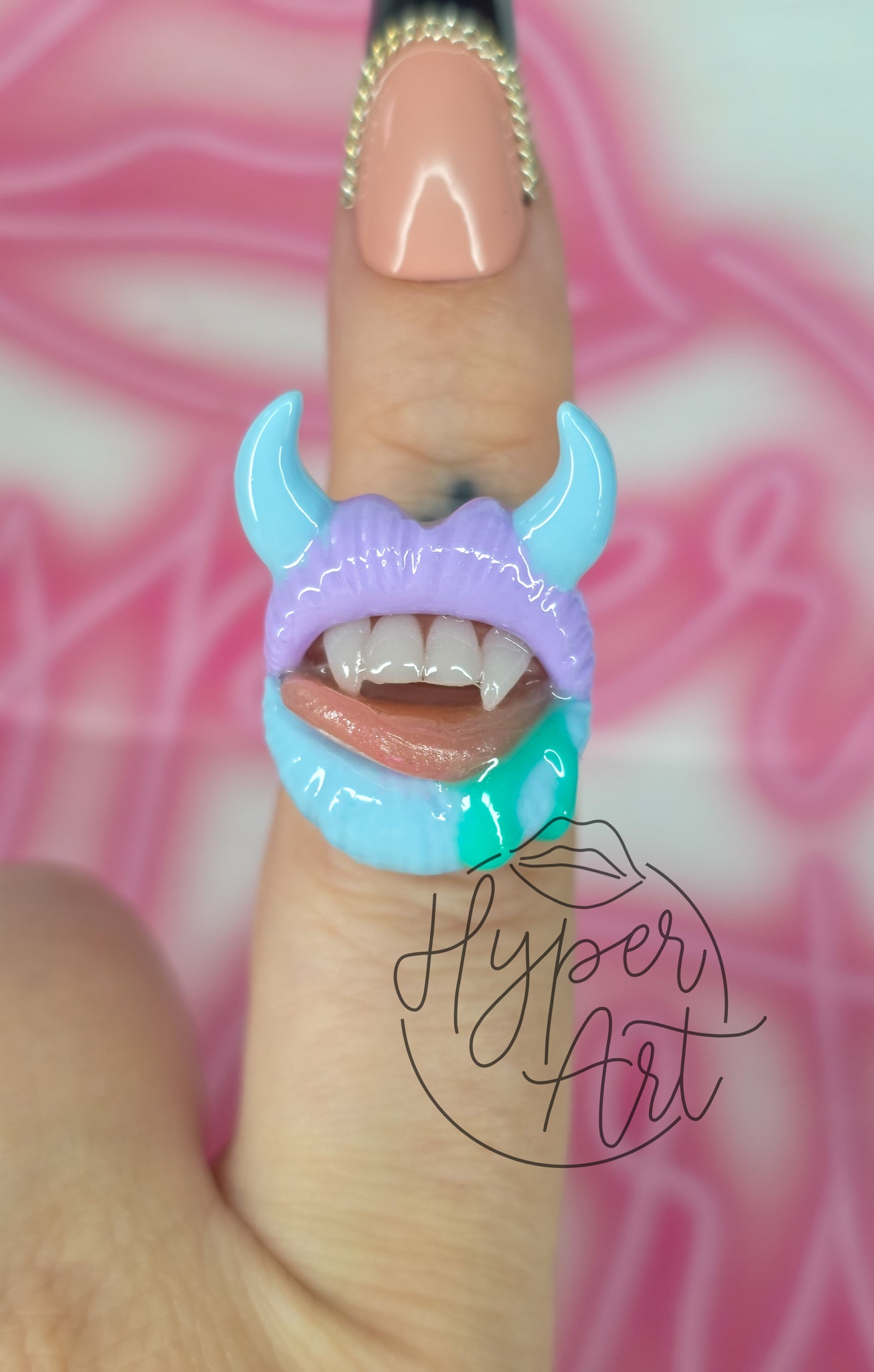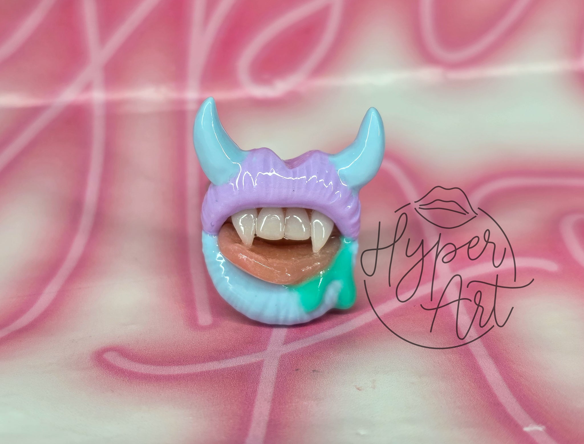 The Soft Static Ring is a whimsical wearable art piece that celebrates imaginative self-expression. Featuring a striking purple upper lip and powder blue lower half, it's adorned with playful blue horns that protrude from the top. A cheeky curled tongue detail adds personality, while a refreshing mint green drip completes the fantastical design. Perfect for collectors, artists, and anyone who loves unconventional accessories that spark joy and conversation. Wear it as a statement of creative confidence and individuality.