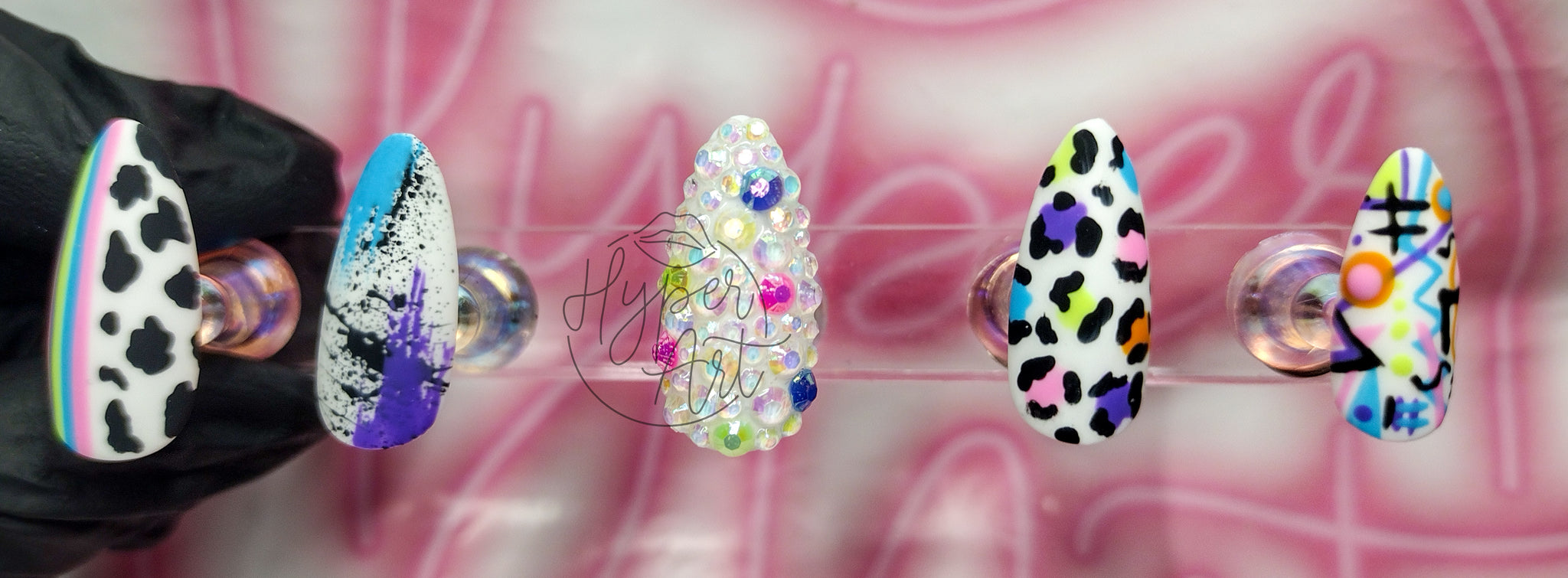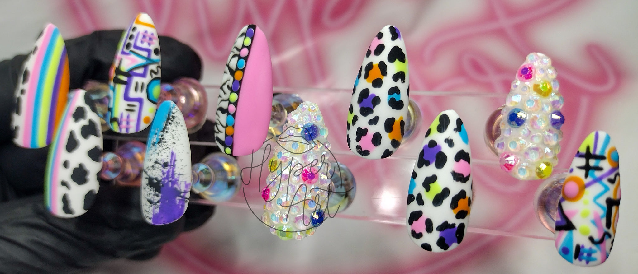 Unleash your inner diva with Tagged Up Press-ons featuring mixed prints, neon colors, and a touch of rhinestones. These nails are perfect for a playful and fierce look that will make all your friends jealous. (Don't worry, we won't tell anyone it's press-on!)