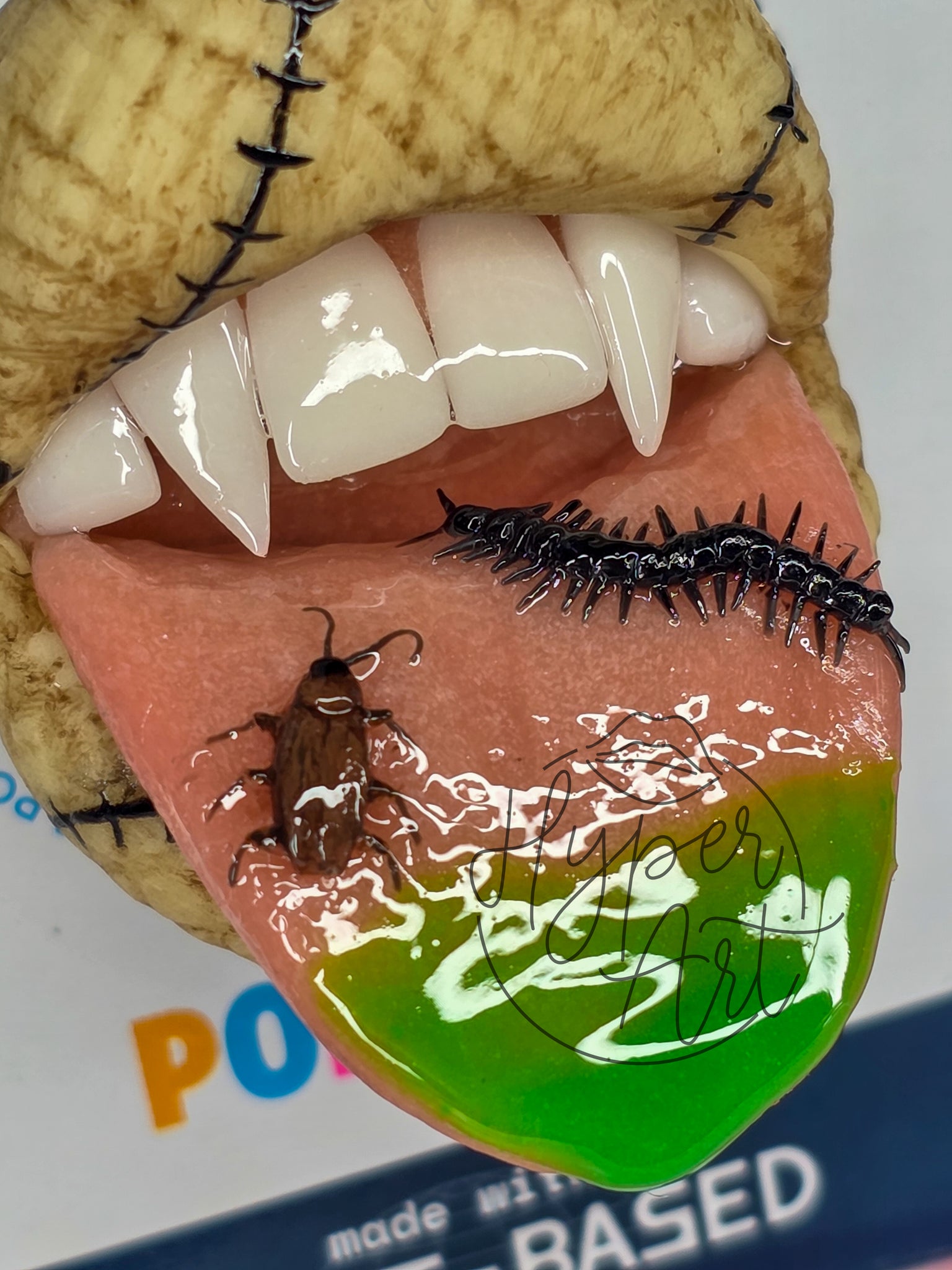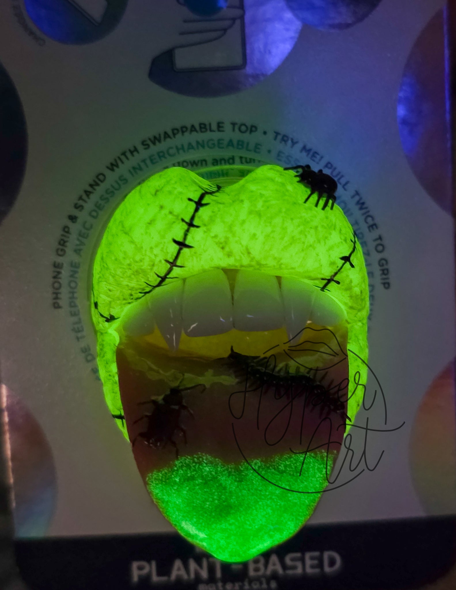 The Gambling Ghoul Popsocket features a burlap-textured lip design that glows in the dark, capturing eerie vibes with a daring twist. Boldly displaying a gross cockroach, millipede, and spider crawling on the lips, dripping green ooze, this accessory brings Oogie Boogie’s spooky charm to your device. Perfect for those who want to make a dark, adventurous statement with every grip.