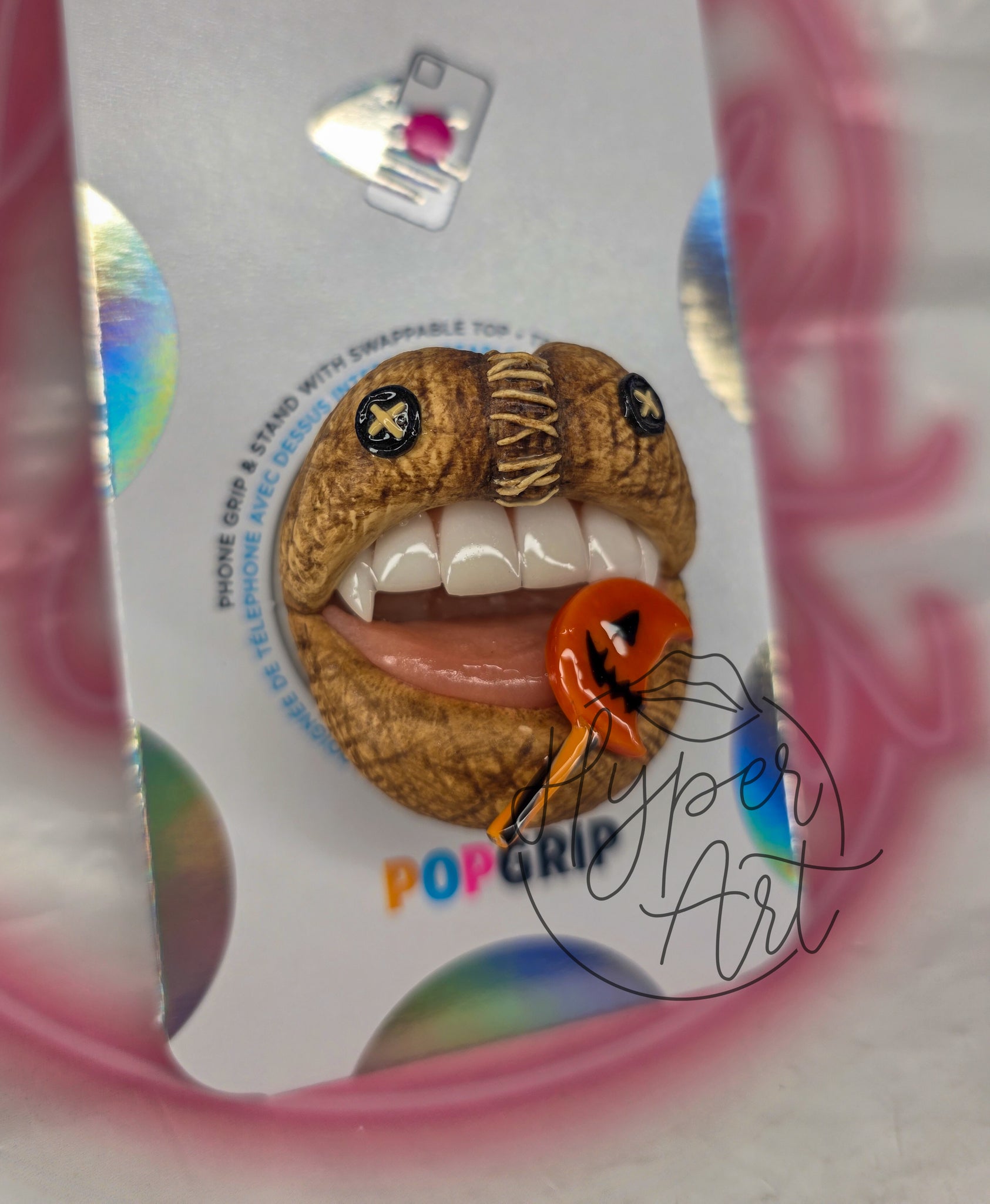 Embrace a bold statement with the Trick R Trauma Popsocket featuring gritty burlap lips and Sam’s iconic button eyes, fiercely biting down on his signature lollipop. This daring design adds edge and personality to your phone grip, perfect for fans craving a touch of Halloween mischief every day.