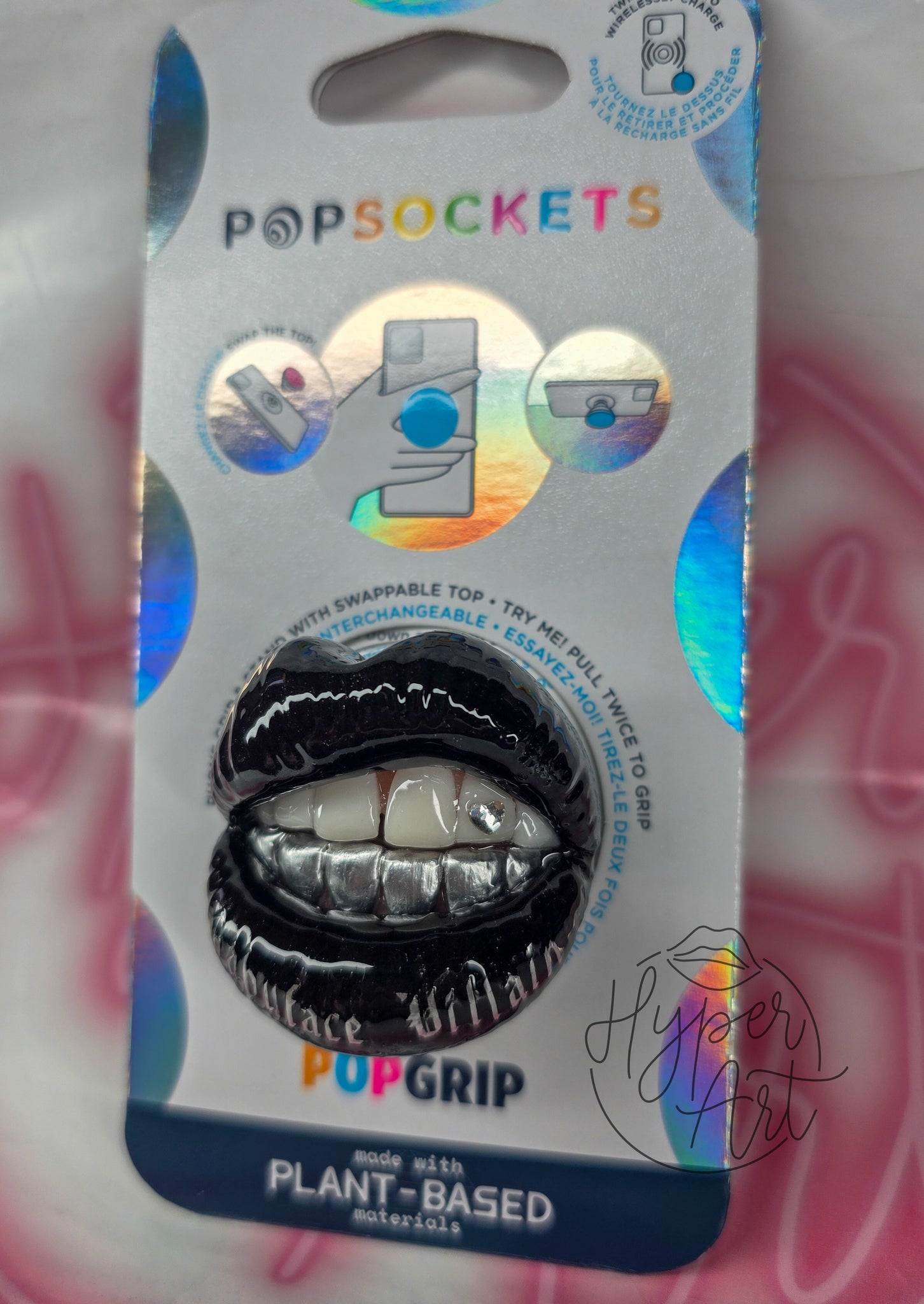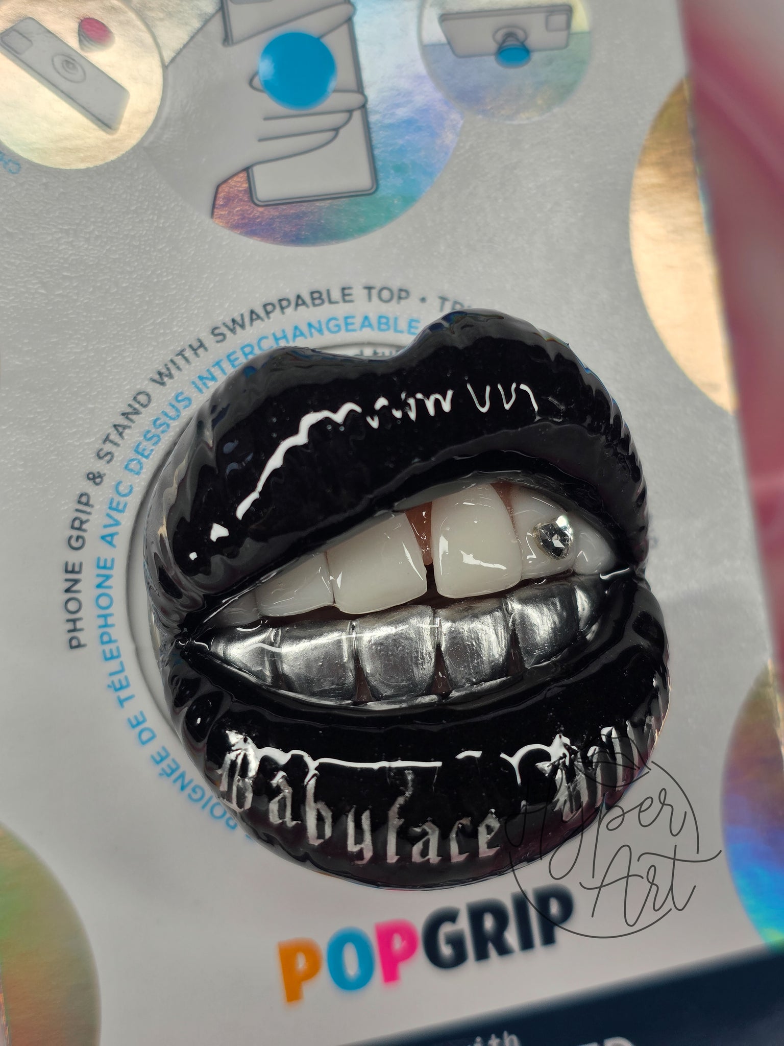 The Villainette Popsocket features glossy black lips revealing top and bottom teeth, with the bottom teeth adorned in silver grills. A heart-shaped tooth gem adds a bold accent, while the bottom lip boldly displays the phrase "babyface villain." This daring design makes a striking statement for your phone.